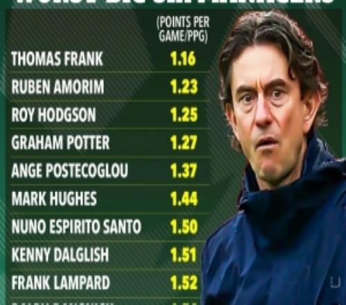 太阳报:弗兰克是英超史上成绩最差的Big6正式主帅,场均仅1.16分