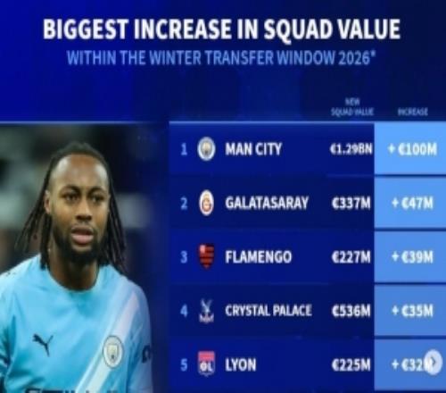 冬窗后球队身价上涨榜:曼城+1亿欧最多,切尔西、吉达联合在列