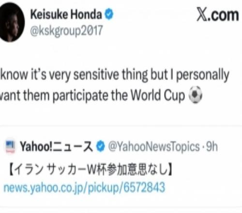 前日本国脚本田圭佑社媒:虽然很敏感,但希望伊朗能参加世界杯