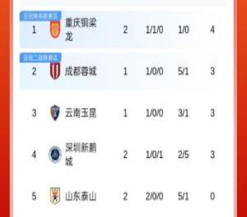 中超积分榜:铜梁龙4分暂列榜首,泰山0分第5,津门虎负9分仍垫底