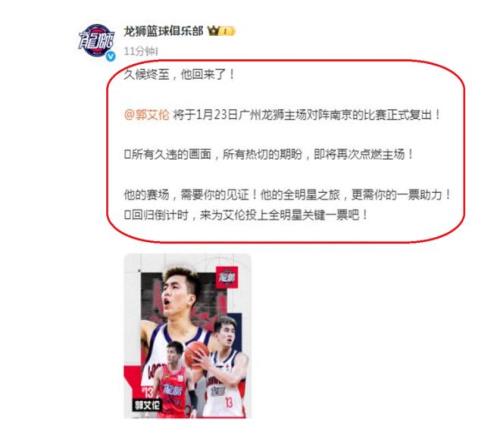 根据广州队公布的消息了解,郭艾伦将会在1月23日正式复出,到时候,广州队将会坐镇主场PK同曦队。那么,郭艾伦复出将会有什么样的表现呢?也是让球迷十分期待。