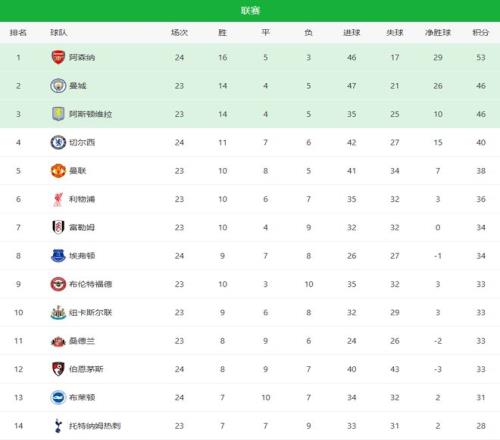 随着切尔西32逆转+阿森纳40!英超最新积分榜:曼联被挤出前四_24直播网