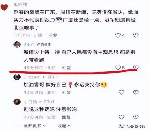 北京昨晚对阵山东的比赛,赵睿整体表现欠佳,在社媒引起了一部分球迷吐槽,赵睿仿佛心情欠佳,在社媒与球迷互动当中,出现了一些偏激的情绪表达引发球迷不适,特别是涉及到部分新疆球迷。