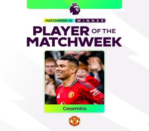 曼联中场卡塞米罗凭借在对阵富勒姆的比赛中的出色表现,被评为英超联赛第24轮最佳球员。