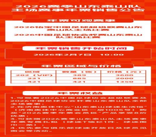 根据泰山官方信息,山东泰山2026赛季主场赛事年票可以观看泰山中超和足协杯主场比赛,将于2月7日10点开售。