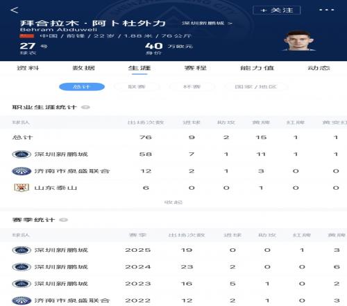 拜合拉木现年22岁,身价40万欧元。2024年冬窗,深圳新鹏城花费51.4万欧元从山东泰山U19签下拜合拉木,上赛季他为新鹏城出场19次,没有进球入账。