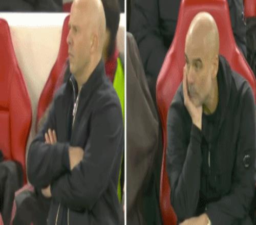此时,镜头来到场边的两位光头主帅,反应可谓截然不同。斯洛特挥拳转身庆祝,瓜迪奥拉一脸无奈!