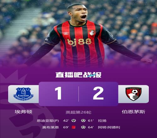 体育播报2月11日宣 北京时间3:30,英超第26轮埃弗顿vs伯恩茅斯,比赛在希尔·迪金森球场打响!上半场,恩迪亚耶越位进球被判无效;拉扬送点,恩迪亚耶点射破门!下半场,拉扬将功补过头球扳平比分!奥布莱恩直红雪上加霜!最终,埃弗顿主场1-2遭伯恩茅斯逆转,英超5轮不败终结;伯恩茅斯英超6轮不败!