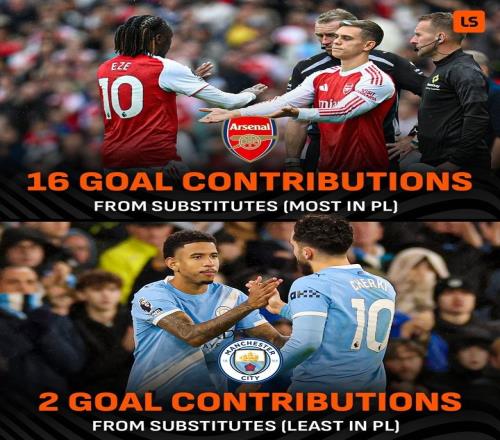 本赛季,阿森纳替补球员在英超参与了16个进球,在联赛排名第一,而曼城的替补球员只参与2个进球,联赛最少。
