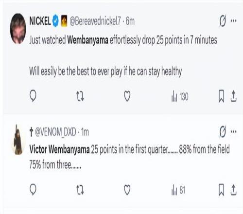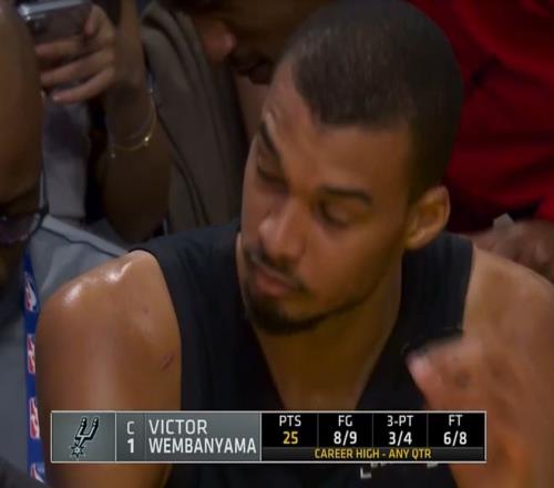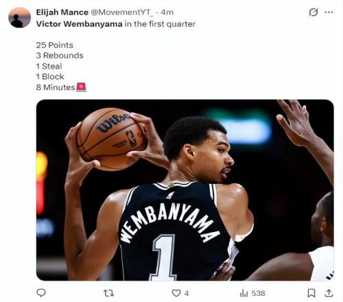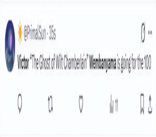 美球迷:文班亚马这是要打破张伯伦单场100分的纪录吗?(8分钟25分,那么16分钟就是50分,24分钟就是75分,32分钟就是100!当然这是一种夸张的说法,文班亚马要打破单场100分的纪录还是很难)