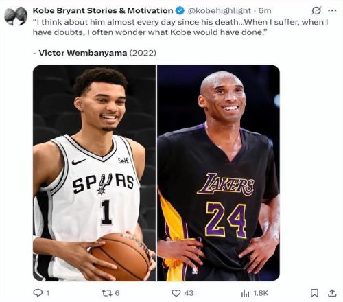 科比的球迷组织回忆了文班亚马2022年悼念科比的言论:自从科比去世后我几乎每天都会想起他。当我遭遇困难、产生疑虑时我经常会思考科比是怎么去做的。