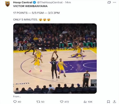 北京时间2月11日,湖人轮休多人,马刺这边则是全主力出战,维克托-文班亚马在首节7分59秒里拿到25分,这场比赛成为文班亚马表演赛。(科比曾在湖人主场拿到81分)