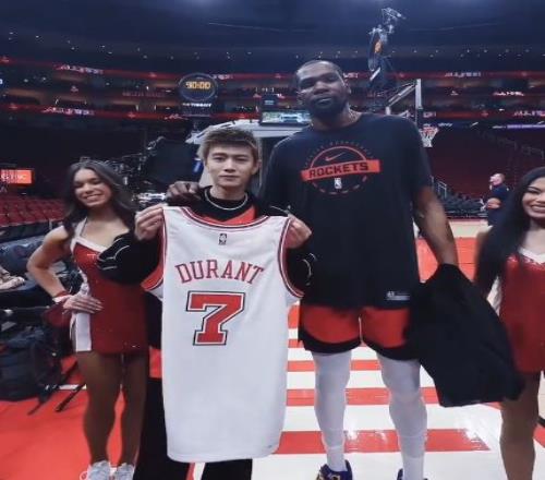 中国明星任嘉伦现身火箭主场观战,与杜兰特互换礼物。