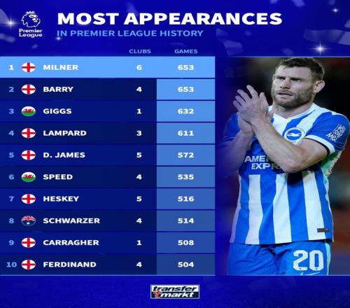 体育播报2月12日宣 布莱顿在本轮英超对阵阿斯顿维拉,40岁米尔纳替补出战。数据统计显示,他也追平巴里并列英超历史出场王。