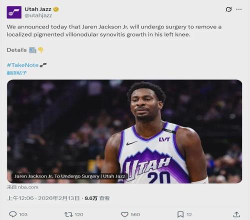 今天凌晨,犹他爵士队官方宣布:小贾伦-杰克逊将接受手术,切除左膝局部色素绒毛结节性滑膜炎增生,本赛季报销。NBA名记Tim MacMahon补充报道,爵士在交易体检的过程中,已经发现了这个问题,但爵士坚持完成了交易。