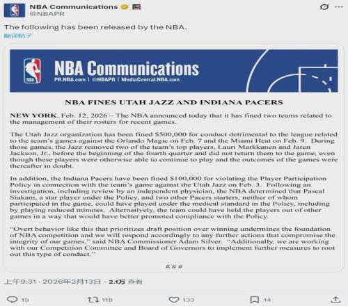 北京时间2月13日上午9点半,NBA开出重磅罚单:爵士被联盟罚款50万美元,步行者被罚款10万美元。此前几场比赛中,爵士在第四节开始之前换下3J和马尔卡宁等主力球员。步行者则是违规轮休西亚卡姆,联盟认为他可以出场。