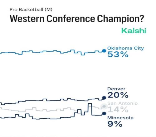 体育播报2月13日宣 预测平台Kalshi Hoops更新了本赛季西部冠军概率,具体如下:
