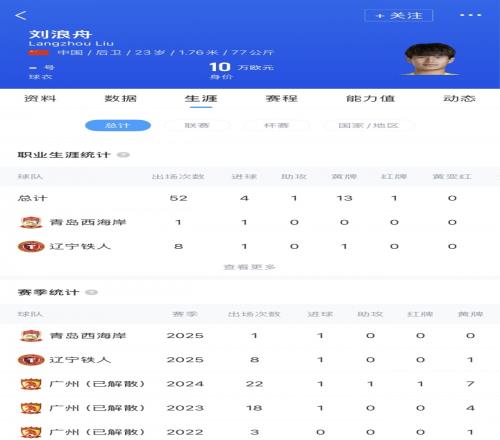 刘浪舟出自恒大青训,2025年初加盟青岛西海岸,去年6月租借加盟辽宁铁人。