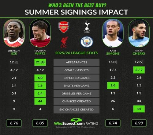 体育播报2月14日宣 whoscored对比了英超四大豪门在去年夏天的攻击型中场引援,维尔茨和谢尔基表现更好。