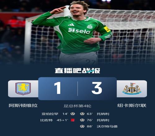 体育播报2月15日宣 英格兰足总杯第4轮,阿斯顿维拉在维拉公园球场迎战纽卡斯尔联。上半场,维拉通过精妙任意球配合由亚伯拉罕打进一球,门将比佐特出击犯规破坏墨菲准单刀被直红罚下;下半场,托纳利两脚精彩远射帮助纽卡反超比分,沃尔特马德锁定胜局。最终纽卡斯尔联以3-1逆转客胜维拉,杀进足总杯16强。