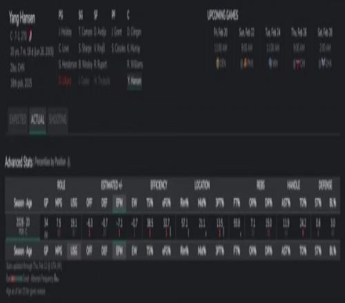 其次是面板数据部分,小杨的效率只胜过1%的球员,失误只胜过2%球员,抢断只胜过1%的球员,进攻篮板只胜过23%的中锋,防守篮板只胜过11%的中锋,这些数据都会影响EPM。
