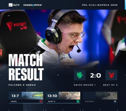 体育播报2月14日宣 CS2大赛PGL克卢日-纳波卡今日开战,Falcons横扫3DMAX,迎来开门红!3DMAX掉入0-1组。
