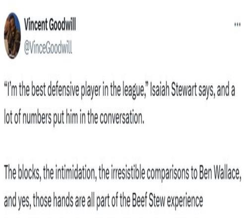 北京时间2月28日,活塞内线以赛亚-斯图尔特认为,自己已经坐稳了NBA顶级防守球员的位置,同时也帮助球队拿到了联盟第一的战绩。“我就是联盟里最好的防守球员。”斯图尔特在接受ESPN记者古德维尔采访时说道。在不少人眼中,他就是活塞新一代的大本。