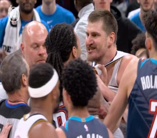 怒火中烧的约基奇自然咽不下这口气,塞尔维亚人马上起身冲向多尔特进行对峙,他双目圆睁,表情凶狠。杰林·威廉姆斯和霍姆格伦见形势不妙,快步上前挡在了二人之间,阻止了冲突的规模进一步扩大。虽然说10多名球员、裁判、教练和工作人员瞬间围成一团,但大部分人依然保持理性,坚定劝架的立场,事态因此没有进一步升级。