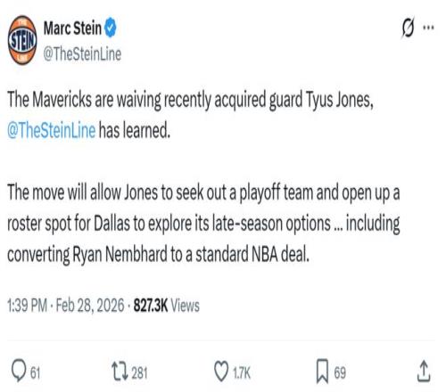 根据名记Marc Stein最新报道,独行侠将裁掉后卫泰厄斯-琼斯,以帮助他加盟一支季后赛球队的同时,自身也能腾出一席正式名额用于转正身背双向合同的奇兵瑞安-内姆哈德。