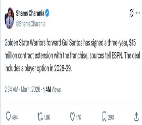 在湖勇焦点战开打前,名记Shams曝出勇士提前以一份3年1500万美元合同续约了桑托斯,合同包含28-29赛季球员选项。