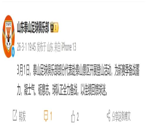 山东泰山官方微博写道:“3月1日,泰山足球俱乐部部分代表赴泰山景区开展登山活动,为新赛季备战蓄力,凝士气、砺意志。球队正全力备战,以佳绩回馈球迷。 ”