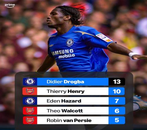 赛前Prime Sports列出了21世纪以来两队交手的射手前五位,德罗巴13球居首,亨利、阿扎尔列二三位。