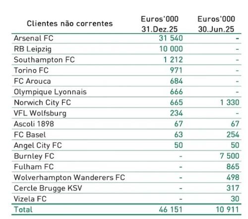 根据公开信息,截至去年12月31日,葡体已经实际到账约2000万欧元转会费,文件显示,阿森纳仍需向葡萄牙体育支付接近4700万欧元的转会费。未来一年内(流动款项),阿森纳需支付1546.8 万欧元,阿森纳还要在超过一年的未来支付(非流动款项)3154万欧元。