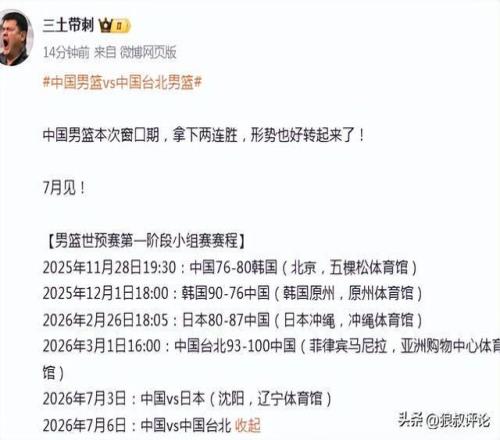 男篮世亚预小组赛,中国男篮100-93战胜中国台北男篮。在比赛结束之后,男篮官方第一时间发布了关于这场比赛的一...