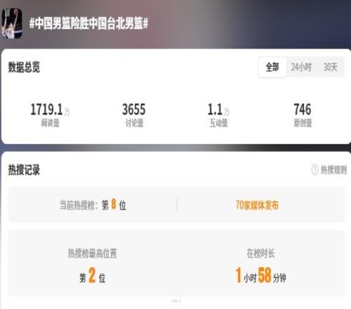 赛后,“中国男篮险胜中国台北男篮”的词条冲上微博热搜,最高排名第二位!