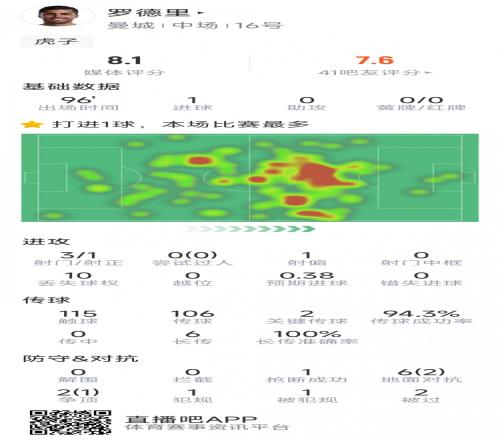 罗德里本场数据:1粒进球,3射1正,2次关键传球,评分8.1分_24直播网