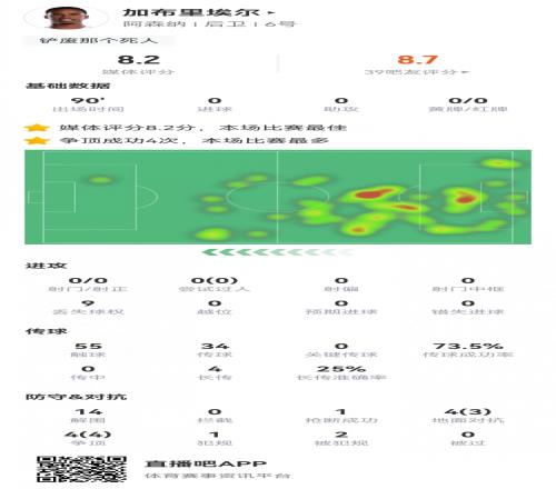 体育播报3月5日宣 本轮英超,阿森纳1-0客胜布莱顿。此役加布里埃尔首发打满全场,球员全场重点数据如下↓
