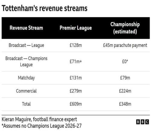 此外,转播收入也将暴跌。热刺将不再享有英超巨额的国内与海外转播分成,要知道,上赛季仅伊普斯维奇的转播收入就超过了巴塞罗那。