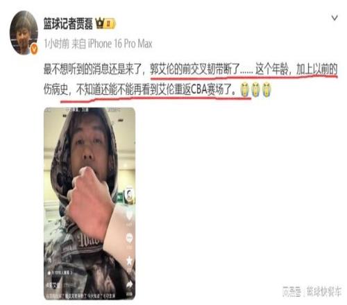 赛后,经过医院的诊断,郭艾伦的伤情终于出来了。根据最新消息,郭艾伦是前交叉韧带断了。作为一个33岁的老将,这是他最不愿意碰上的伤病。按照目前的状况,郭艾伦本赛季大概率是回不来了。有知情人士透露,郭艾伦这个伤病康复周期比较长,大概率是一年。这也就意味着,郭艾伦已经提前赛季报销了。另外,以郭艾伦目前的状态和伤势,他是否能够重返CBA,还真是一个未知数。