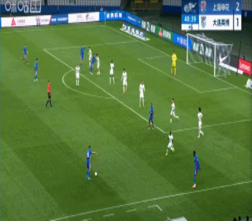第45+4分钟,申花不依不饶,禁区内马马杜防地高空球冒顶,拉唐一脚推射再下一城,申花3-1领先大连英博!