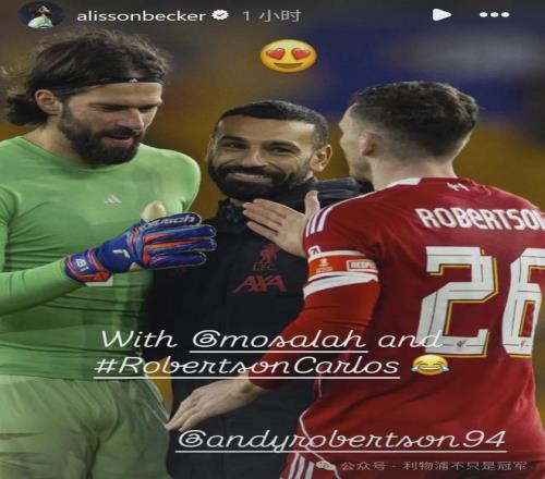 同样是“老家伙”的阿利森,似乎也明白了球迷的心意,他赛后晒出自己与萨拉赫和罗伯逊的同框照,并直接称罗伯逊为:罗伯逊-卡洛斯!