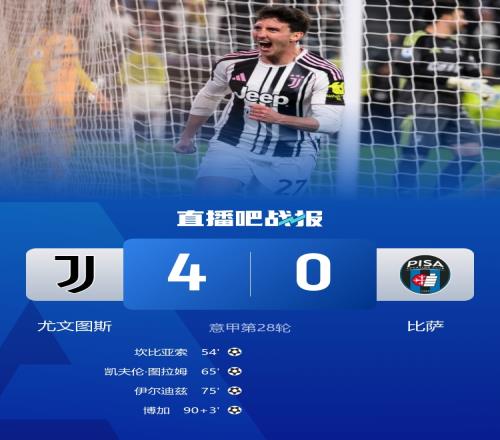 坎比亚索破、图拉姆、伊尔迪兹、博加破门,尤文4-0击败比萨,终结4轮不胜的颓势。