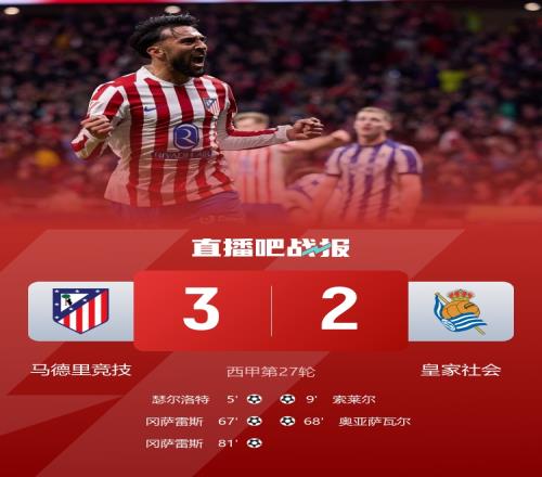 冈萨雷斯梅开二度,马竞3-2皇家社会。积分榜上,马竞积54分排名第三,皇家社会积35分排名第八。