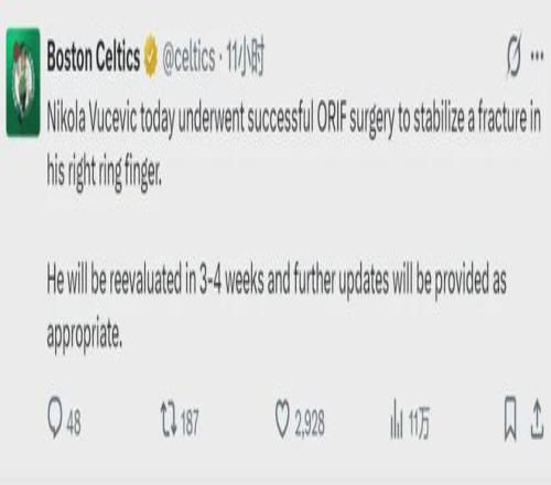 北京时间3月8日,凯尔特人官方宣布:球队中锋武切维奇今日成功接受右手无名指骨折的切开复位内固定术(ORIF),将在3-4周后进行复查。常规赛将在4月中旬结束,还有5周的时间,凯尔特人希望武切维奇能在收官阶段复出。