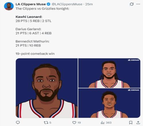 这场比赛快船队再也不是只依靠伦纳德一人,加兰26分钟20中8+三分8中3拿到21分6助攻4篮板;马瑟林35分钟,15中6,罚球9中9拿到21分10篮板。