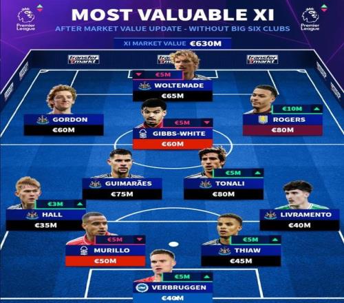英超非BIG6球员最贵11人阵容:托纳利8000万领衔,纽卡7人入选