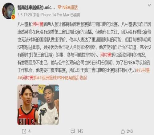 日本男篮那边的河村勇辉,大概率同样因为要参加夏联放弃世预赛征程,八村塁一般不会参加亚洲赛事且今夏得进入NBA自由市场难以兼顾国家队任务。