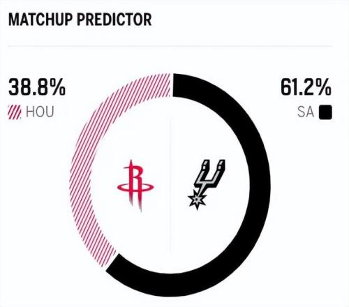 赛前,美媒ESPN对本场比赛进行了胜率预测,马刺队胜率高达61.3%,火箭胜率则仅有38.7% ,差距还挺明显。