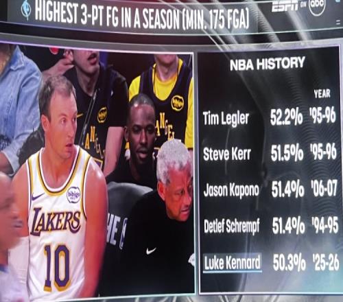湖人VS尼克斯,转播方晒肯纳德数据,本赛季肯纳德三分命中率已经来到50.3%,能排进NBA单赛季历史前五(至少出手175次及以上):