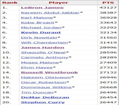 NBA得分历史排名: